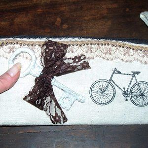 Handmade Key, brown lace Bike print bag with zipper closure.