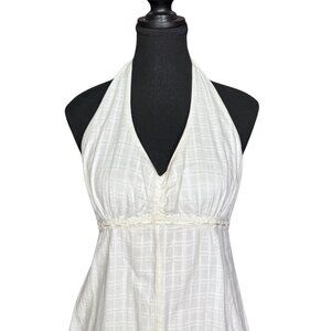 Step into carefree summer style with this vintage Billabong halter dress — the perfect blend of boho charm and coastal cowgirl vibes. Made from 100% cotton with a soft lining, this airy white dress features a subtle textured plaid pattern, braided trim accents, and a flowy asymmetrical hem that moves beautifully. Ideal for festival days, beach weddings, fairycore picnics, or laid-back Y2K-inspired outfits.