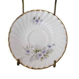 White with gold trim, featuring pastel lavender, green and white wild flowers pattern