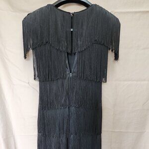 Vintage 1990s Algo-Ettes black all-over fringe flapper dress perfect for your next party. The zipper comes up to the waist and the back is open from there to the button at the back of the neck.