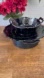 This elegant vintage black amethyst glass serving set includes a deeply etched handled plate and a matching 12 oz bowl with striking Art Deco-style floral and scroll detailing. The rich, nearly opaque glass reveals deep plum hues under light—a signature feature of collectible black amethyst glass. This particular set, etched with the "Sterling" pattern, is both refined and rare, ideal for collectors of depression and elegant glassware.