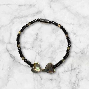 Elegant black metal beaded bracelet. Features colourful shell heart accents, magnetic closures. Perfect for any occasion.
