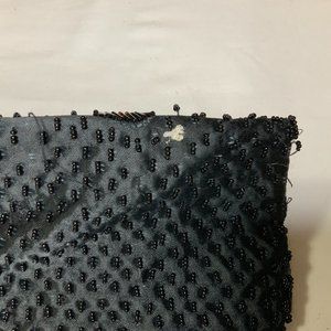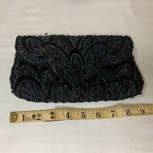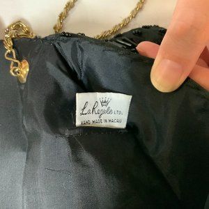 This is a vintage black beaded clutch/purse with a black lining. It has a gold tone chain that could be tucked inside and can be held as a clutch or worn as a purse. The inside label reads: La Regale Ltd. Handmade in Macau. Condition: small fabric missing on the back and some beads are missing.