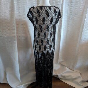 Step into timeless elegance with this jaw-dropping vintage sheer, black, beaded evening gown. Crafted from sheer stretch lace and adorned with intricate beading in a floral lattice pattern, this sleeveless stunner is the definition of statement dressing.