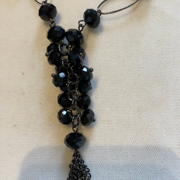 Two strands of beads/gunmetal rings converge in graceful pendant of beads, ending in a tassel of strands.