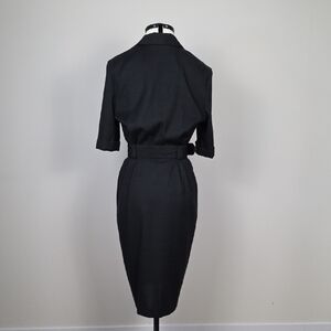 vintage black dress, utility dress, belted midi dress, safari dress, minimalist black dress, timeless vintage style, 80s inspired dress, 50s style dress, tailored trench dress, workwear chic, classic silhouette, black collared dress, belted waist dress, capsule wardrobe essential, minimalist aesthetic, neutral outfit, Parisian chic dress, no label vintage