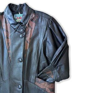 Vintage Black Brown Leather Geometric Print Oversized Mid-Length Jacket 80s 90s