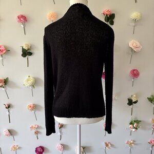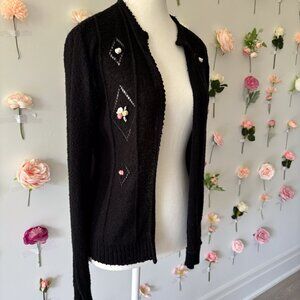 Charming vintage black cardigan featuring a beautiful embroidered floral design. Adds a touch of elegance and nostalgia to any outfit.