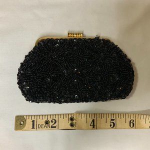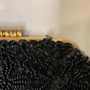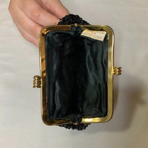 A beautiful black vintage coin purse with a black sequin, gold tone frame and kiss lock closure. Handmade in Hong Kong. Condition: tear near the closure.