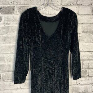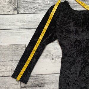 Vintage Richards modest witchy dark black crushed velvet 3/4 sleeve scoop neck deeper back neckline small structural shoulder pads fit and flair midi dress. Sheer sparkly floral mesh lace inserts at the bottom hem.