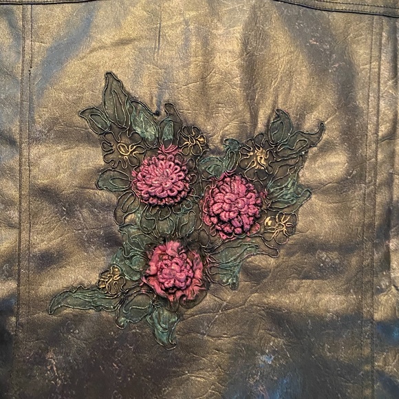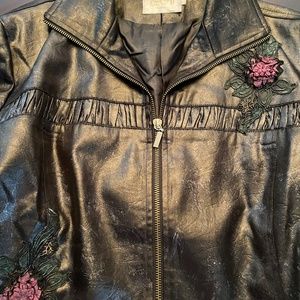 Red Coral brand jacket,size large, black distressed leather look with floral appliqué on front and back of jacket, no rips or tears, very good condition.