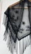 Chic black lace wrap with floral beaded designs and long silky flowy fringe tassels. . Ideal for evening events and having something delicate for your shoulders when wearing a dress or costume.