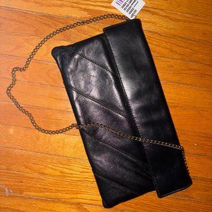 Snap button closure, angular stripe detail on front, lined, 1 interior zippered pocket.