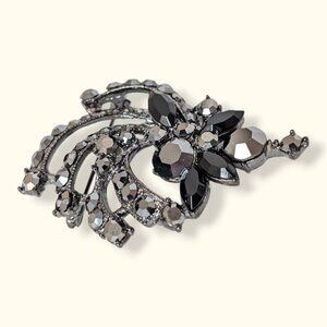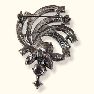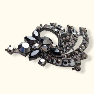 This vintage brooch is made of a dark silver tone metal and has a modern locking c pin closure. The brooch is somewhat abstract in shape, but features marcasite-dotted swirls, with the black glass stones and the largest of the marcasite stones grouped together in the center. At the bottom there is a piece holding a large and small marcasite stone, and this section dangles. It's harder to see when the piece is lying flat, so pic 4 shows the piece hanging down. The brooch has normal wear, but no issues affecting wearability. As far as I can see, there are no stones missing or otherwise damaged.