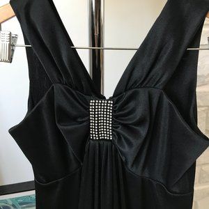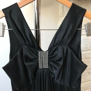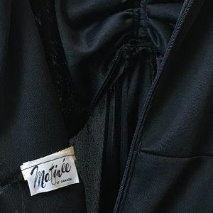 Classic vintage black gown from Matinée of Canada. The cut in the front is not what you would expect as the rhinestones will sit quite high on the neck. This is not the dress to show cleavage. Truly beautiful vintage find.