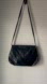 Black leather bag, in very good condition - some minor cracking on exterior (see photos). Front clasp flap closure, removable clasp strap, felt lined interior with three open pockets. Measurements in photos.