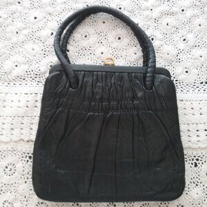 This is a beautifully made soft black leather handbag from mid-century. The leather has been gathered to the leather-covered frame. Inside is black satin with three pockets - one with a zipper and the others without. The clasp is gold tone metal. There is no maker's mark in the purse but it has been extremely well made - that was the era before "fast fashion"!