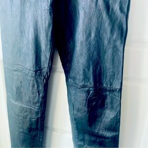 Preloved light signs of wear at the hem, was cut and skirted a bit. Nothing you should regret. This here a Sleek black leather pants. Perfect for a bold look.