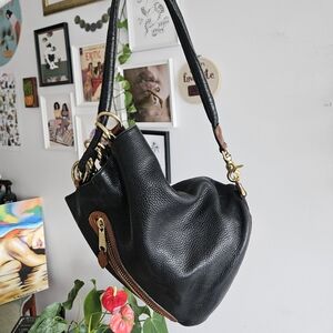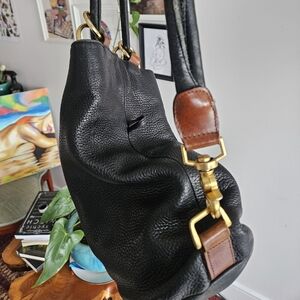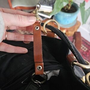 Beautifully made black leather tote bag by Pattie Jarrell. It's a heavy leather with brown leather detailing and brass hardware.