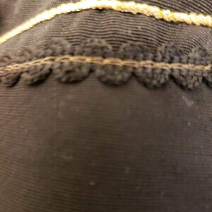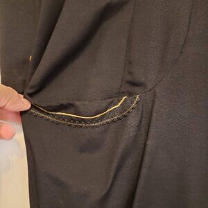 Dress is a form fitting, crew neck, a lovely floral accent in front and has a loose but form fitting shape . Two pockets just below the waistline, have a bit of gold detail. The back is cut in a unique square. Fabric covered buttons all down the back. The long sleeves also have two small fabric covered buttons at the cuff. and there are two additional buttons kept just in case you lose one. The length is a nice cocktail length of 45"; Bust is 19.5" pit to pit; Waist 15"; Hips 21"; Arms are 8 " across at top seam to seam. It is a cold water wash and hang or low heat air dry.