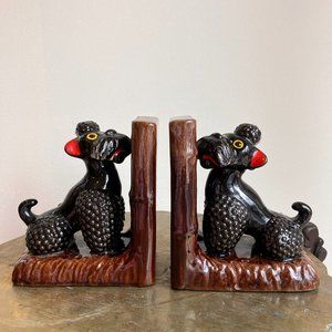 Vintage Black Poodle Bookends 1950's - MCM Kitsch High Gloss Poodles