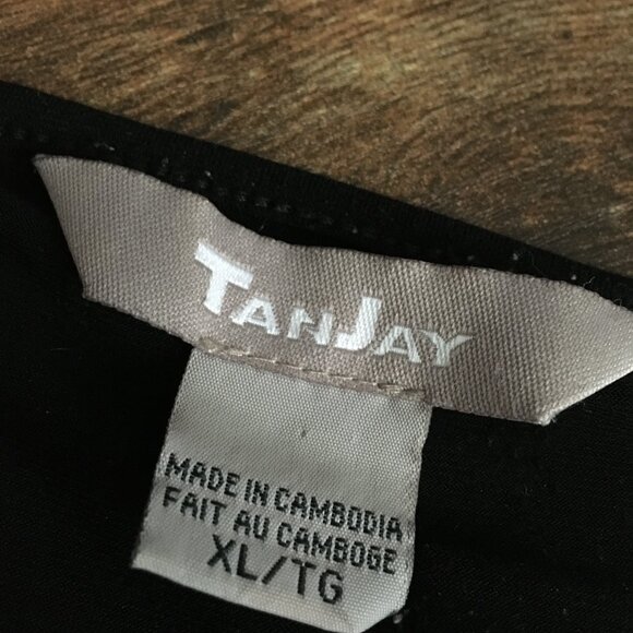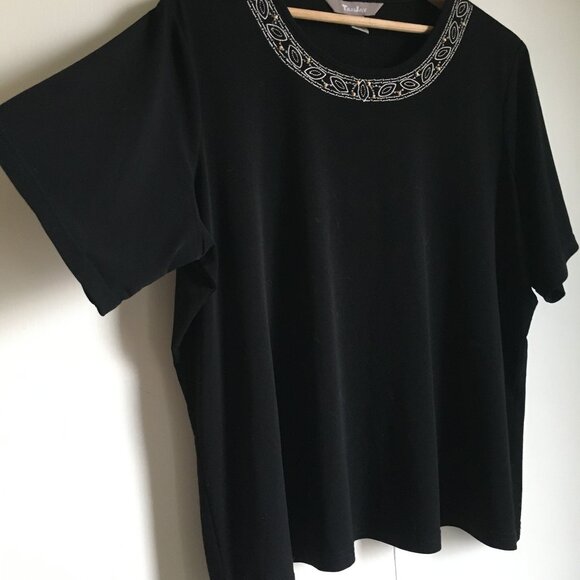 Very good preowned vintage condition black, bouncy, stretchy material with box sleeves by TanJay. Features cute white stitch-work and cream coloured beads.