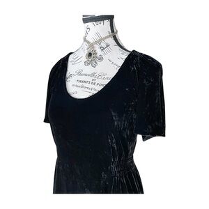A sleek black velvet mini dress with short sleeves and rounded neckline, cut from a silk blend (20% silk). The fabric carries a soft luster and subtle texture, balancing minimal silhouette with vamp undertones. Perfect as a standalone statement or layered under sheer shirts and blazers for a gothic 90s mood.