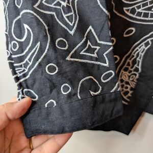 Chic and unique black & white embroidered design in a lightweight linen blend. Features an open front, long sleeves, and a bold paisley/abstract pattern. Perfect statement piece for layering over tops or dresses for work or play.