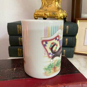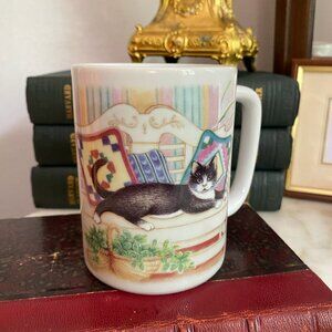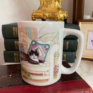 Vintage Black & White Tuxedo Cat Kitten Plant on Bench Otagiri Fraser Ceramic Mug 90s Japan