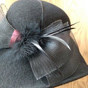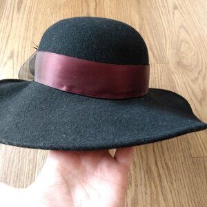 Vintage Black Wool Felt Hat w Large Mesh Bow, Burgundy Ribbon & Feathers 21.25"