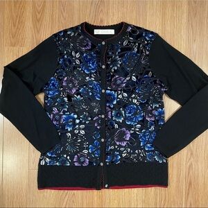 Elegant black cardigan with vibrant blue floral pattern. Perfect for layering.