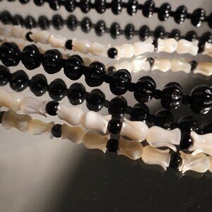 Black and white beaded necklace and shell polished ring set. This unique piece features three strands of beads in a striking black and white color combination. The white beads are particularly unique, as they are cut from natural shell with a subtle floral-like design, giving them a subtle iridescence and organic texture that contrasts beautifully with the smooth black beads.