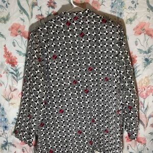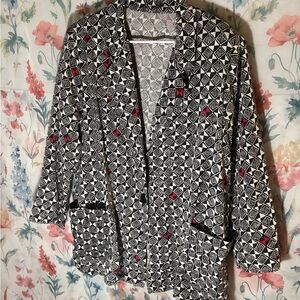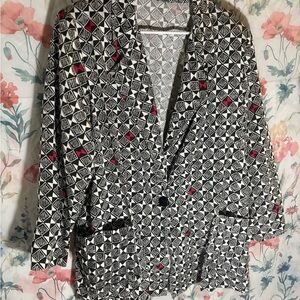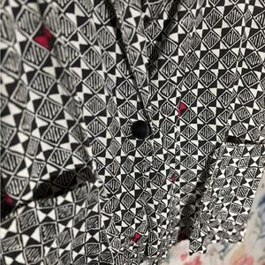 This blazer jacket features a striking black and white geometric pattern, offering a tailored silhouette perfect for professional settings. Its lightweight fabric ensures comfort and style, making it an ideal choice for spring or summer wear.