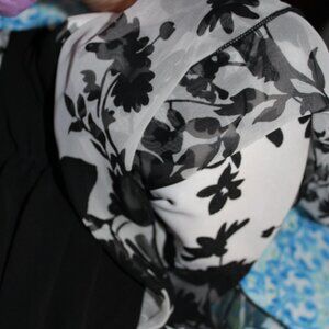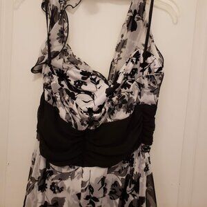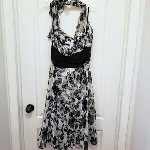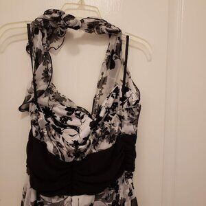 This vintage little black and white sheer halter dress has soft cups with a sheer cover up straps, solid black polyester rouched waist, and sheer georgette over same print underlay every where else. The georgette that covers it is extra soft so the tie around your neck is really. It has a flowing skirt that will move with you. The Bustsize equals 38" the waist can fit up to 33 1/2"; The length is approximately 45".