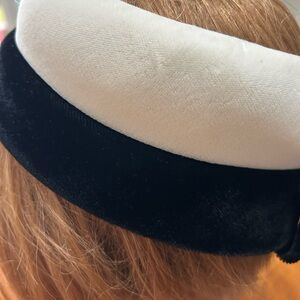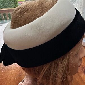 Vintage Black and White pillbox Hat- open top- bow at back- black and white velvet