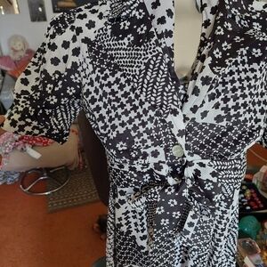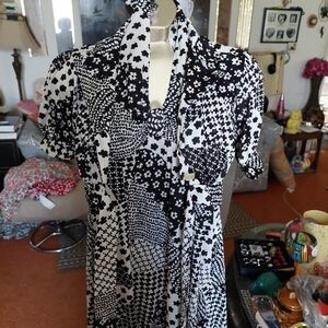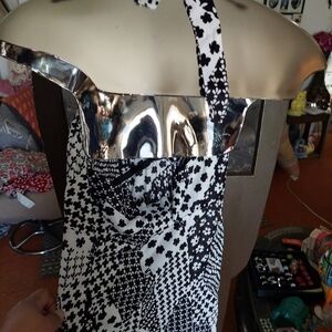 This is such a pretty dress. Zip up back with tie. A-line style. Comes with little short-sleeve jacket. Unfortunately I removed the tags as I find them scratchy. But size 13-14 back then. Dress is 45" long from center. Length can b easily altered to shorten. Polyester. Black/white. Note that maker photo is from the red dress which is same style. Please feel free to message me with any questions.