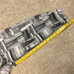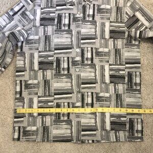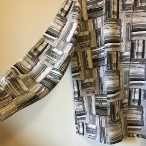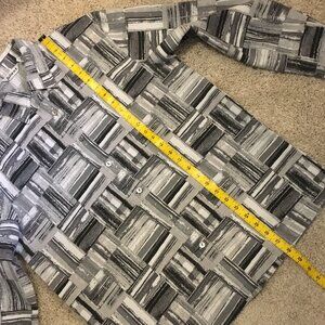 Very good preowned vintage dress shirt by Blast featuring a modern bauhaus/brutalist/modular, geometric pattern in greys, black and white. Buttons are mother of pearl. Nice thick, structured, non stretch material. Labelled small, but feels more like a large.