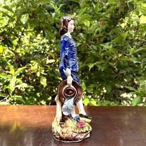 This vintage porcelain figurine depicts the famous “Blue Boy,” inspired by Thomas Gainsborough’s iconic 18th-century portrait. Hand-painted in rich cobalt blue with gilt accents, the figure stands gracefully holding a hat beside him on a grassy base with a flower. Estimated era is approximately 1950s-1970s. Marked Enterprise Exclusive Toronto, Canada, similar to Arnart Creations imports of the same period.