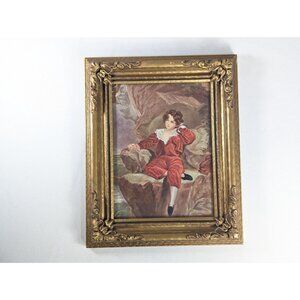 A set of 2 ornate framed prints: Red Boy by Sir Thomas Lawrence (1825) and Blue Boy by Thomas Gainsborough (1770). Both framed in gilded wooden frames, with some damages as pictured, and some chuffing / chipping to the paint, mostly to the corners and edges. I think I see the glass front on blue boy has some damage to a lower corner (chipped), which can be fully hidden by simply sliding the glass a touch sideways inside the frame. The prints are in decent condition with minimal fading / discoloration and a touch of waviness to the surface.