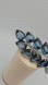 The design features a cluster of large faceted blue teardrop-shaped crystals set in a silver leaf.