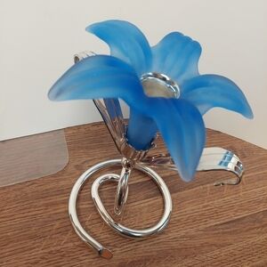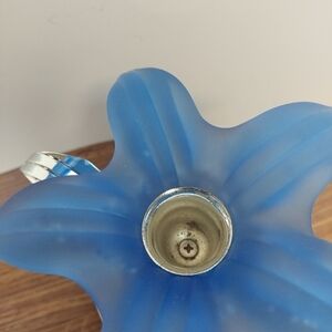 Vintage* Blue Frosted Glass & Metal Lily Candleholder. Approx 7" tall and 6.5" stem to stem.
