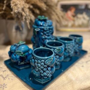 Charming vintage ceramic tea set in rich cobalt blue tones, featuring raised fruit motifs (grapes, apples, etc.). The set includes a teapot with lid, sugar bowl with lid (missing spoon), creamer, four matching mugs, and a rectangular tray. Each piece has a unique sculptural texture and glossy finish. Excellent condition overall.