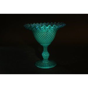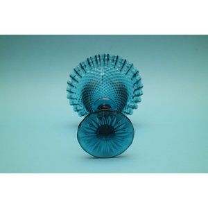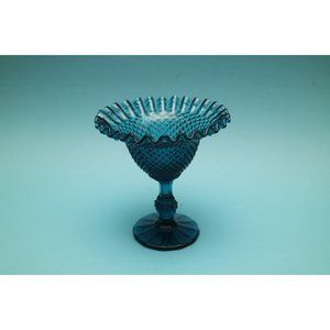 Vintage Blue Glass Pedestal Dish Crimped Ruffle Diamond Point Compote Candy Dish
