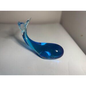 This beautiful hand-blown glass whale paperweight features a rich blue body with clear glass tail fins. Under daylight, the piece displays a striking ocean-blue hue, while under 365nm UV light it reveals a glowing manganese reaction, adding a rare and collectible quality.