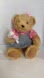 Adorable Blue Jean Teddy plush bear wearing a pink floral top and denim jumper dress, complete with a matching pink hair bow and a tiny stuffed bunny! When wound up, this sweet bear’s head moves gently as music plays. A nostalgic 1990s collectible with beautiful craftsmanship and charming details.