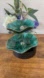 A rare and elegant vintage Blue Mountain Pottery two-tiered serving stand, crafted in the brand's signature green drip glaze. Each tier features a scalloped flower-like edge, flowing organic shape, and vibrant teal-to-deep-brown glaze that shimmers under light. Finished with a polished silver-tone metal handle, this piece makes a striking centrepiece or dessert stand for any table setting.