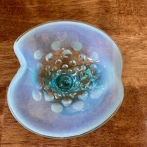 This striking vintage cornucopia vase features a dazzling blue opalescent hobnail design with a graceful flared ruffled rim and curled horn base. Reminiscent of classic Fenton glassware, it glows with a soft milky finish at the edges and catches light beautifully across the textured surface. Its sculptural form and vibrant colour make it a standout accent for any vintage display or floral arrangement.