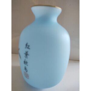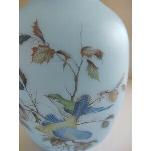 Vintage Blue Satin Glass Hand Painted Birds Vase Japan 7 1/2" x 5 1/2" at widest point...