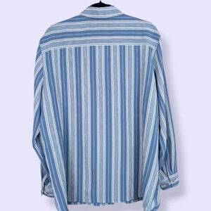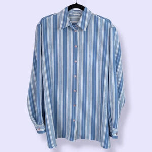 This vintage long sleeve blouse is striped in blue and white and has a front button closure. It also has buttoned cuffs, an extra button, side slits, and velcro sewn into the shoulders (for hot-swapping shoulder pads). The fabric is lightweight and has great movement.