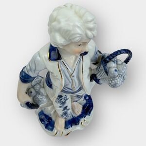Keywords: porcelain figurine, blue & white porcelain, fruit basket boy, decorative collectible, medium large figurine, hand painted blue, gold trim, vintage home decor, collectible porcelain, decorative statue, cobalt blue accents, rustic cottage style, shelf display, gift item, porcelain basket boy